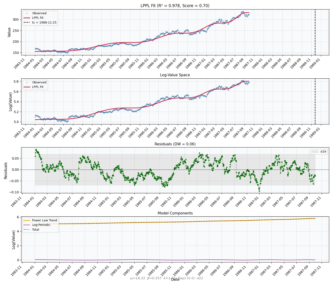 The LPPL model detected the log periodic signature with high confidence, pointing to a critical transition window around November 1988 (a year late, but still within a reasonable 12-month range).