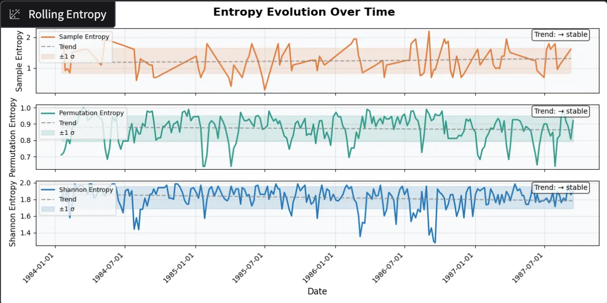 Entropy measures from 3 separate methods (Shannon entropy, permutation entropy, and sample entropy) all showed stable trending in the data.